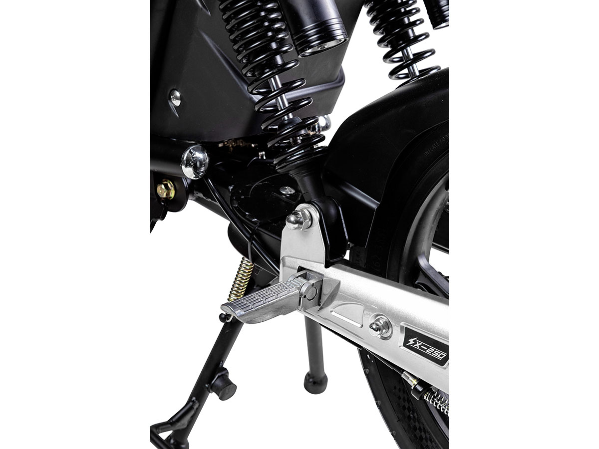With its unparalleled styling and design, this baby will get you to your destination in comfort and style. The SX250 has a brushless, high-efficiency rear hub motor giving you all the torque you need to get where you want to go – and quickly. Its lightweight lithium-ion battery for longer life and shorter charging time comes as standard – as does the front disk brake and adjustable rear shock absorbers. Plus, the SX250 is kitted out with an ultrasonic remote-control alarm with immobiliser and locking steering for optimum security. There’s plenty of storage on-board too with its front glove box. Also, the lighting is all LED so you’ll not only stand out, but you’ll save battery life too.